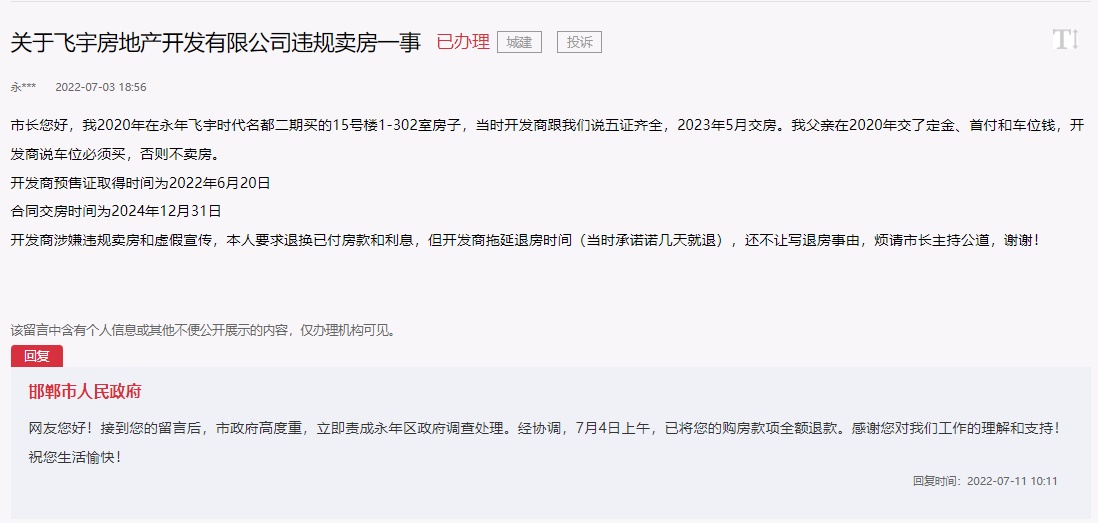邯郸市人民政府回复:网友您好!接到您的留言后,市政府高度重视,立即责成永年区政府调查处理。经协调,7月4日上午,已将您的购房款项全额退款。感谢您对我们工作的理解和支持!祝您生活愉快!